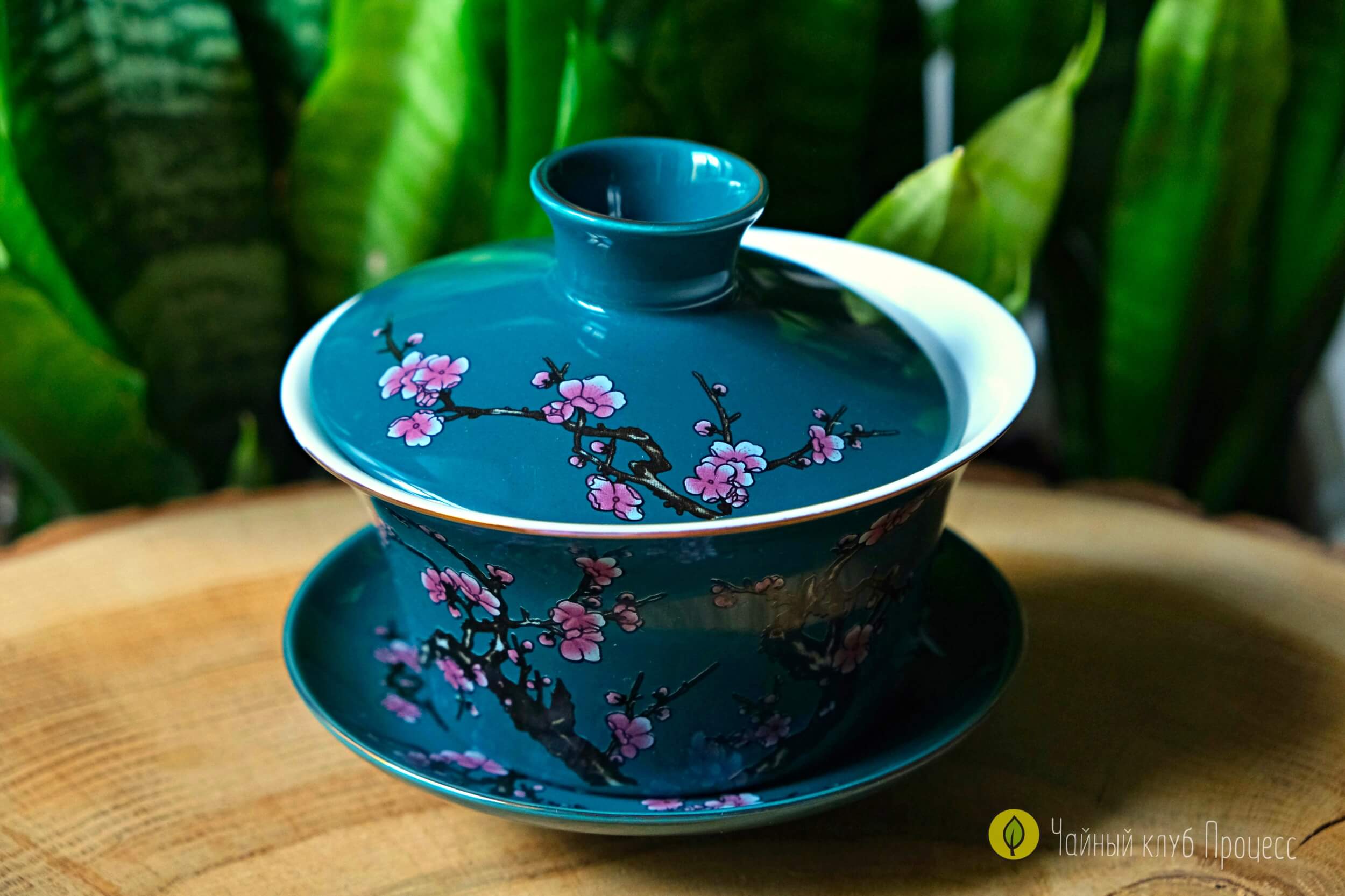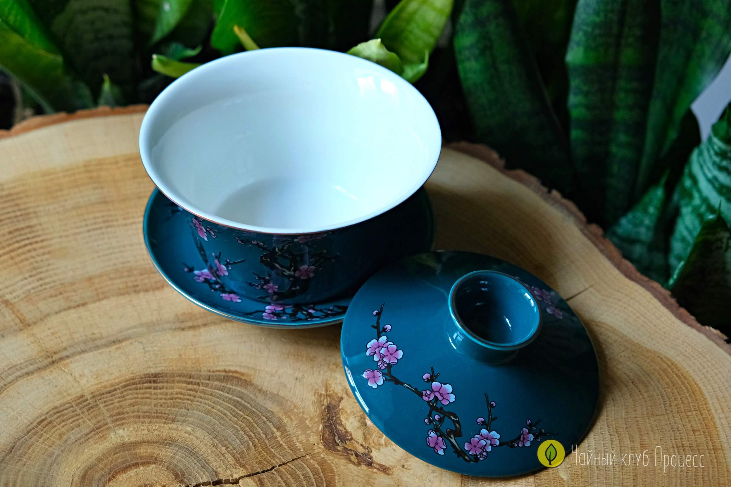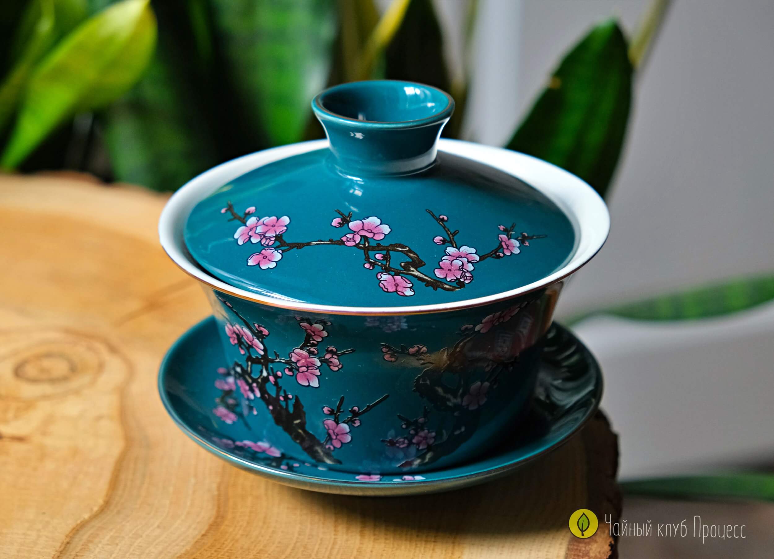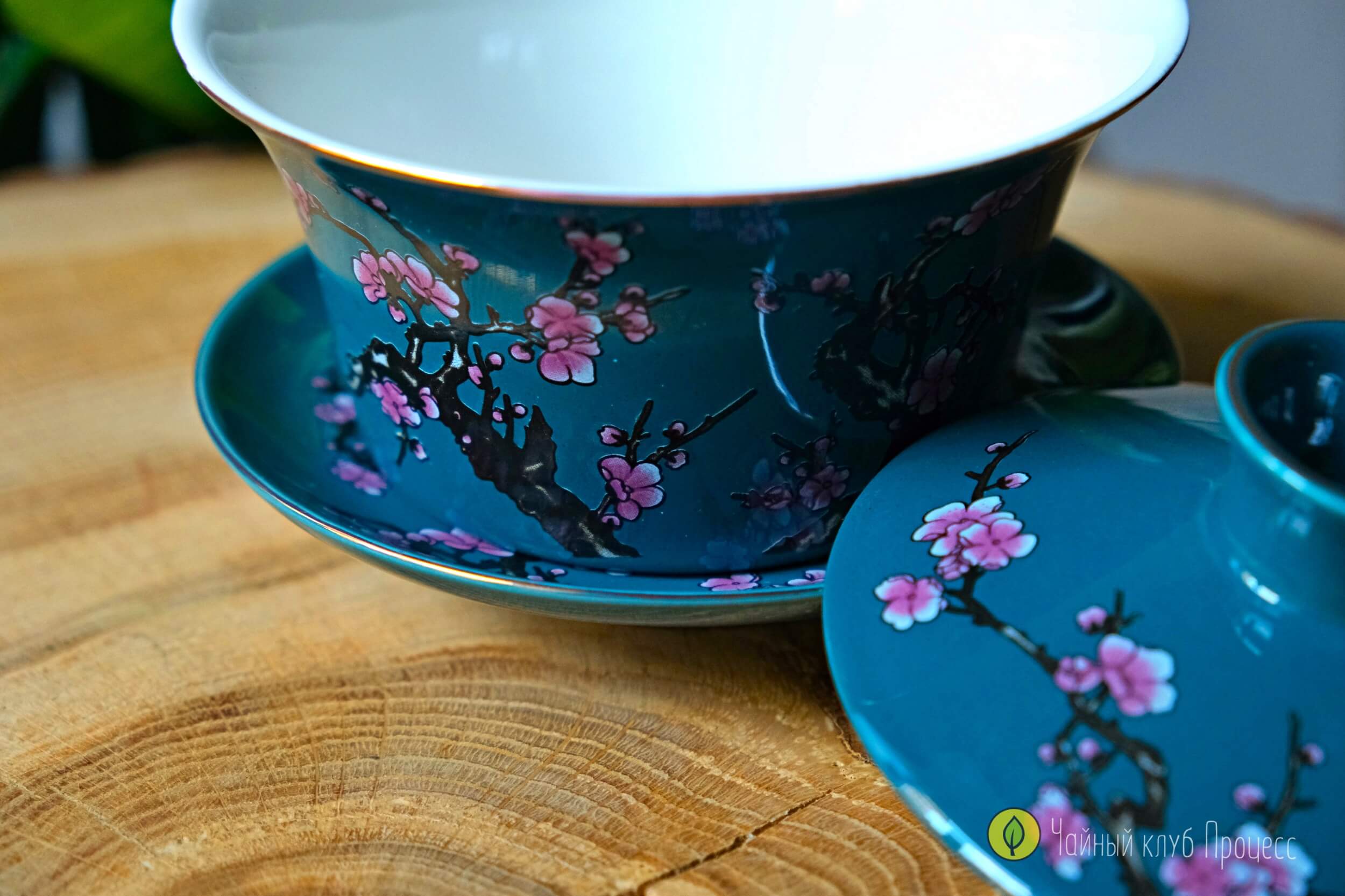 Гайвань «Цветение сливы» — крупная фарфоровая гайвань объёмом 300 мл с изысканным рисунком цветущих сливовых ветвей. Тёмно-бирюзовый фон подчёркивает нежные розовые цветы, создавая атмосферу спокойствия и глубины.