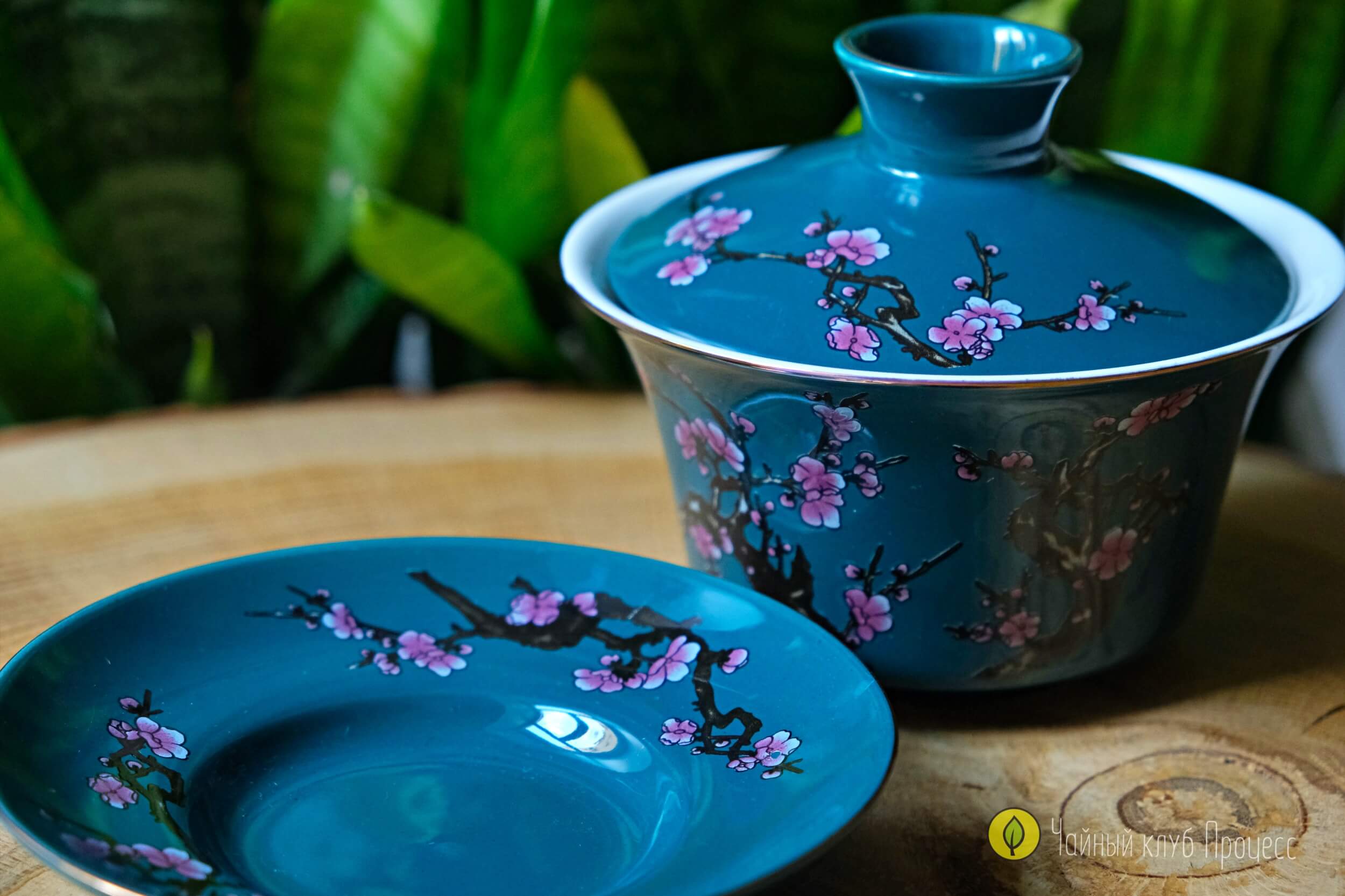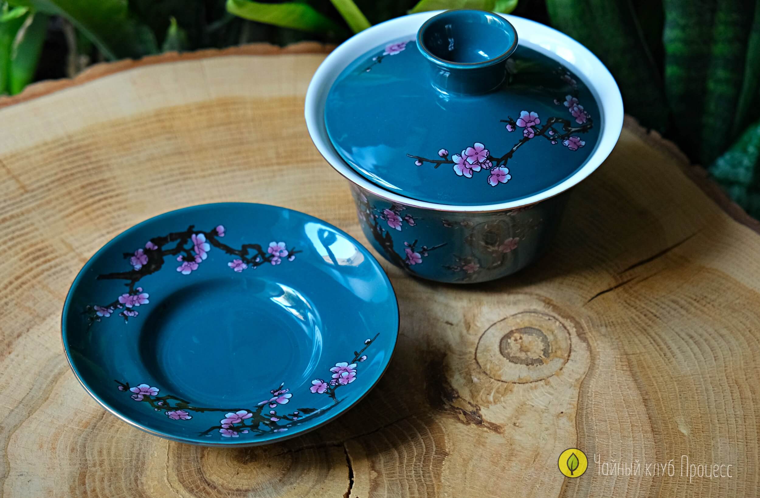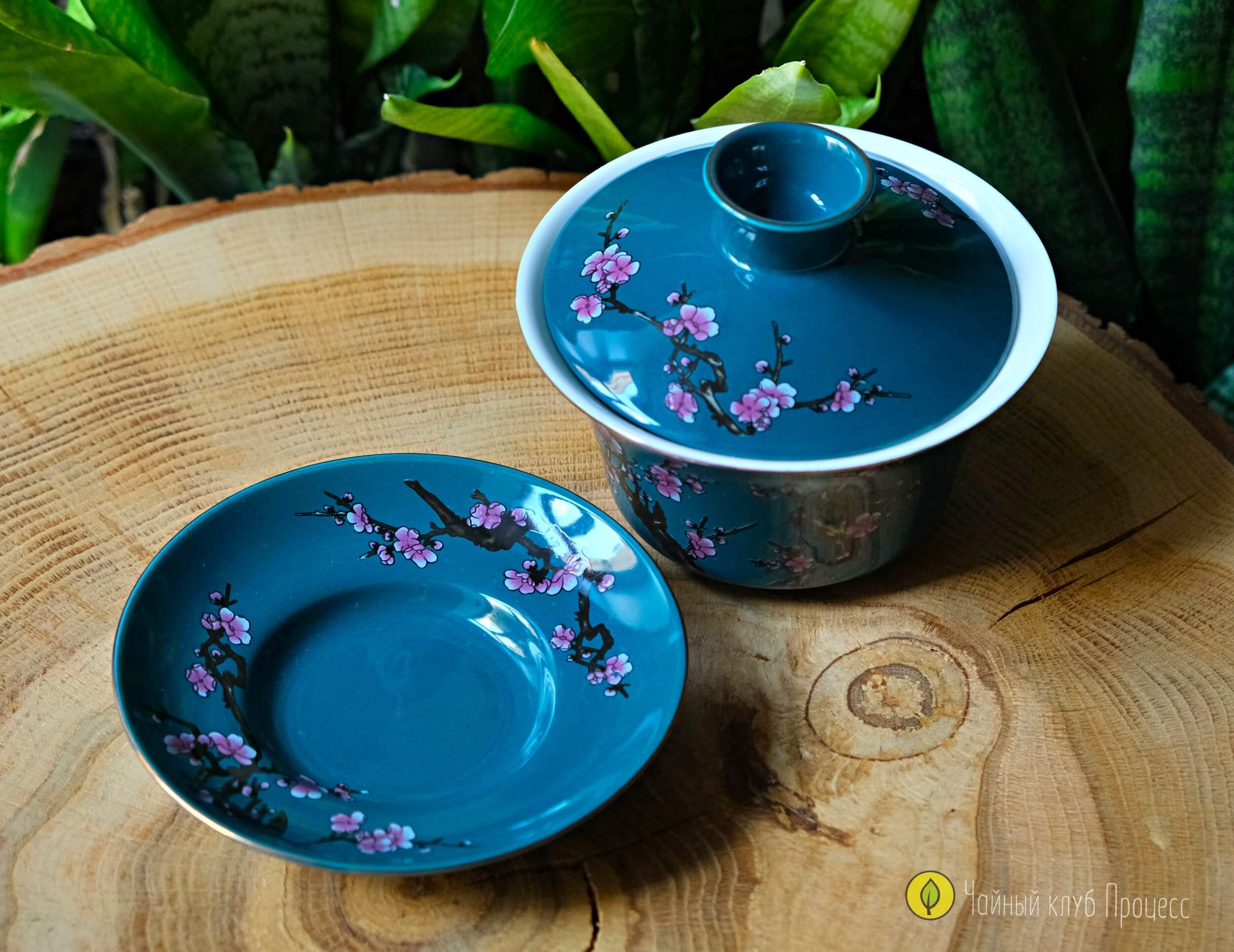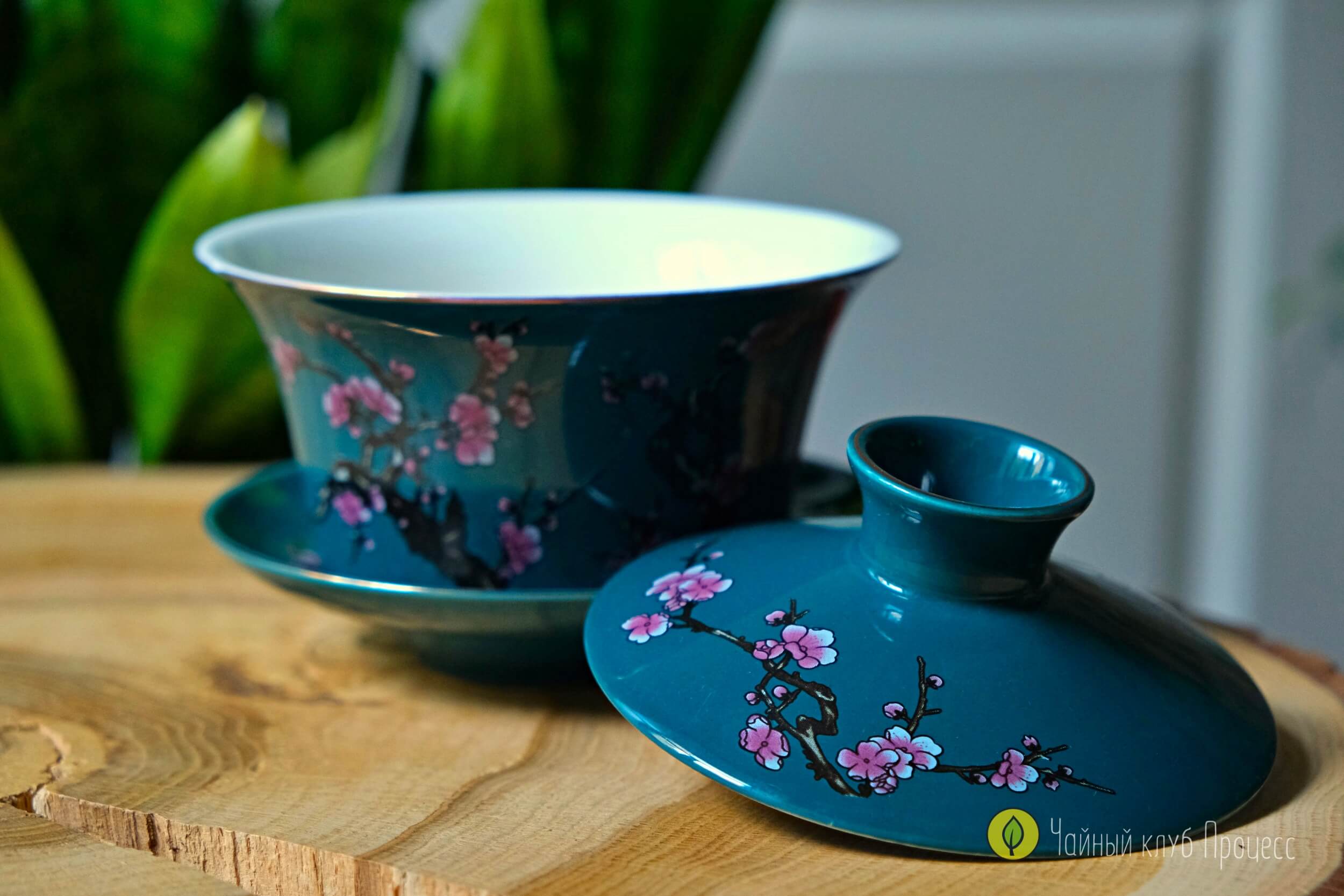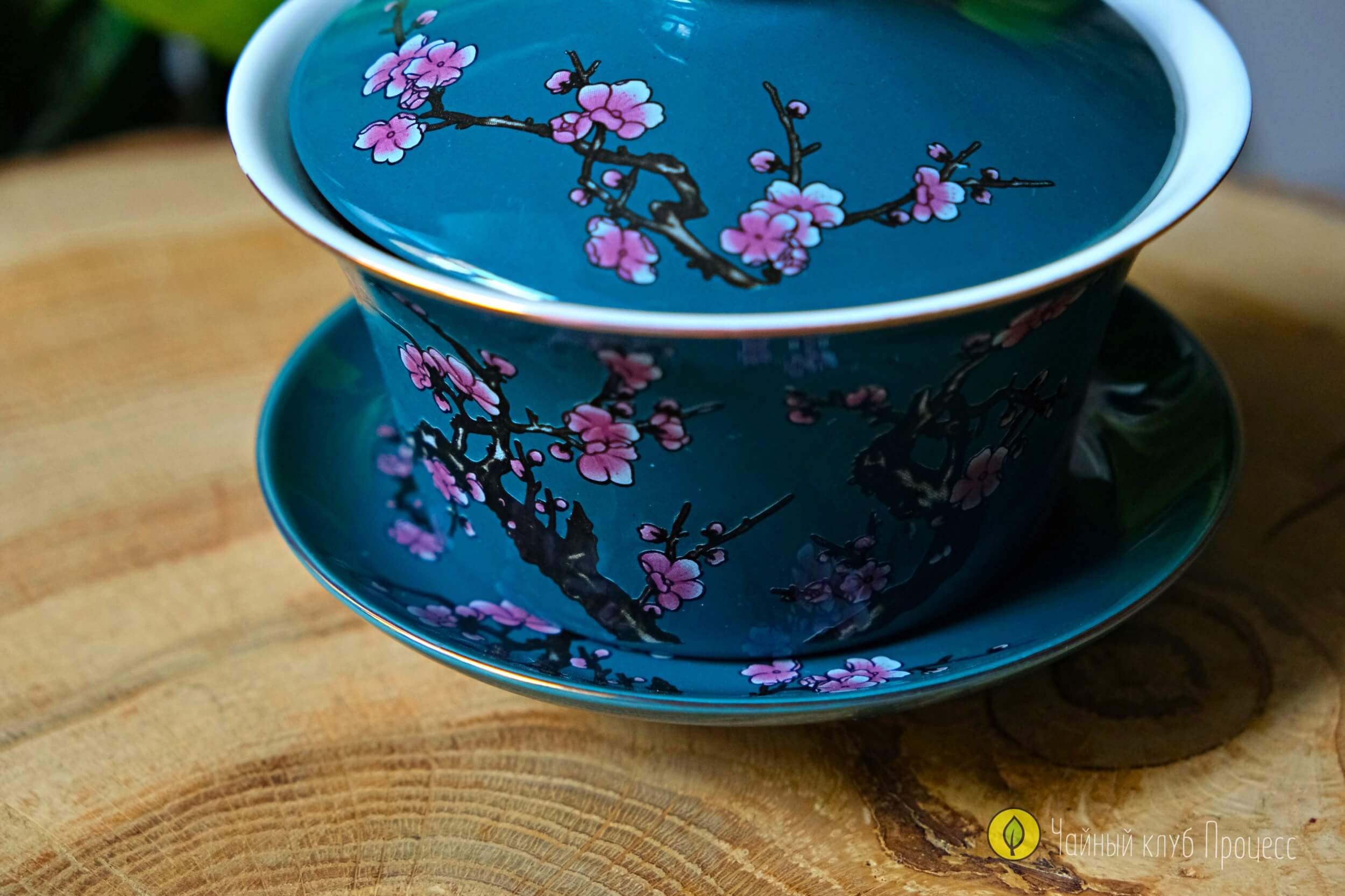 Гайвань «Цветение сливы» — крупная фарфоровая гайвань объёмом 300 мл с изысканным рисунком цветущих сливовых ветвей. Тёмно-бирюзовый фон подчёркивает нежные розовые цветы, создавая атмосферу спокойствия и глубины.