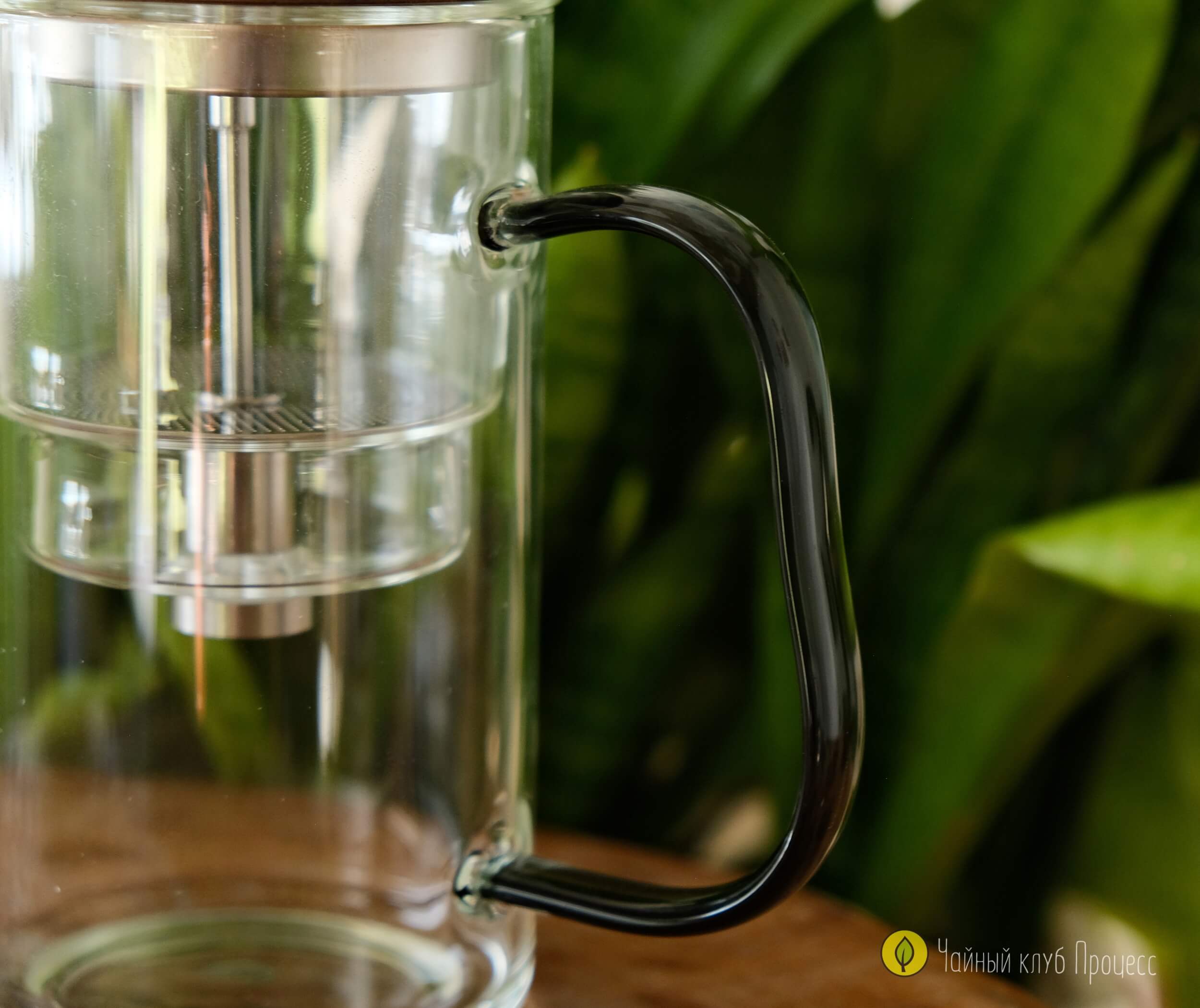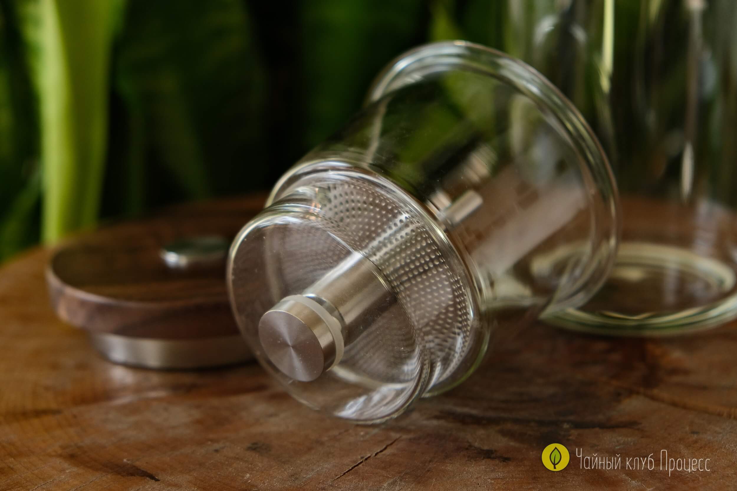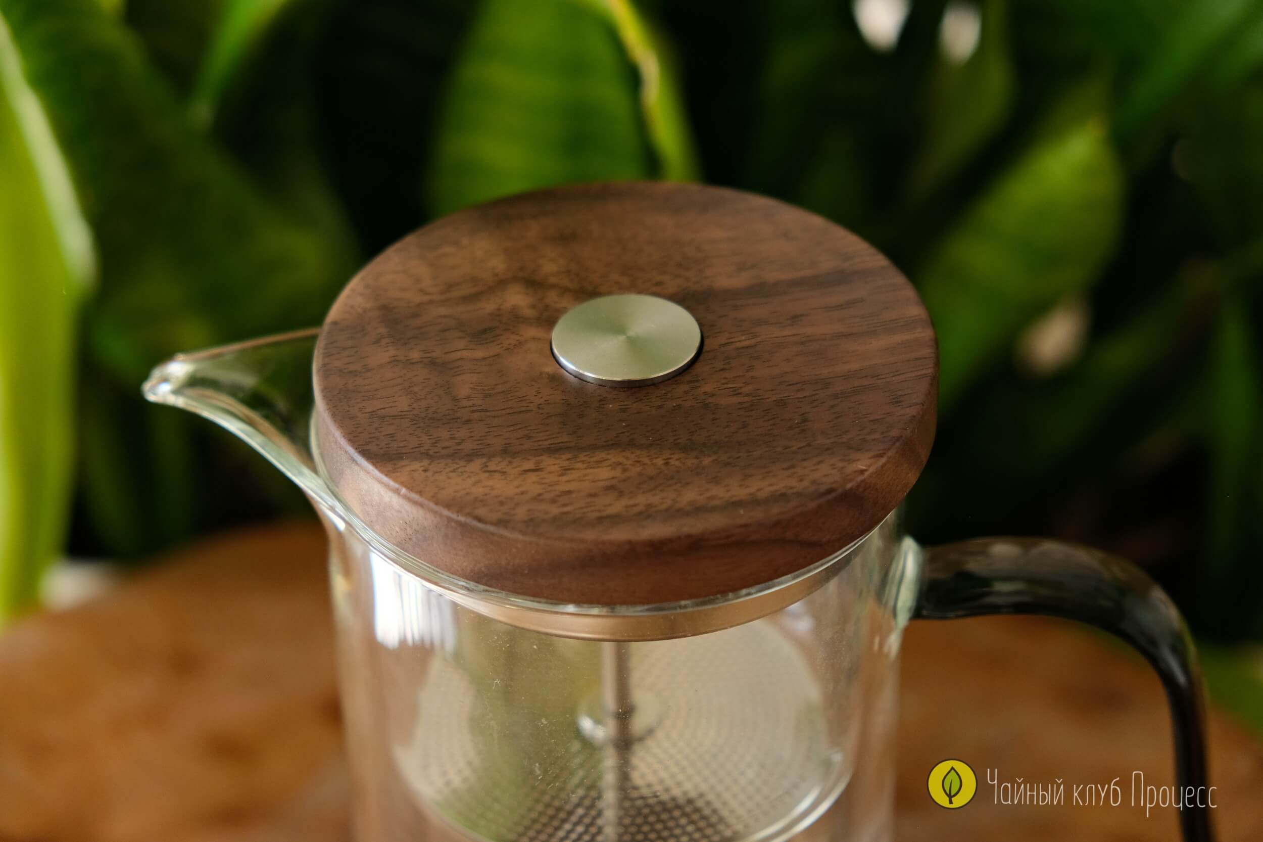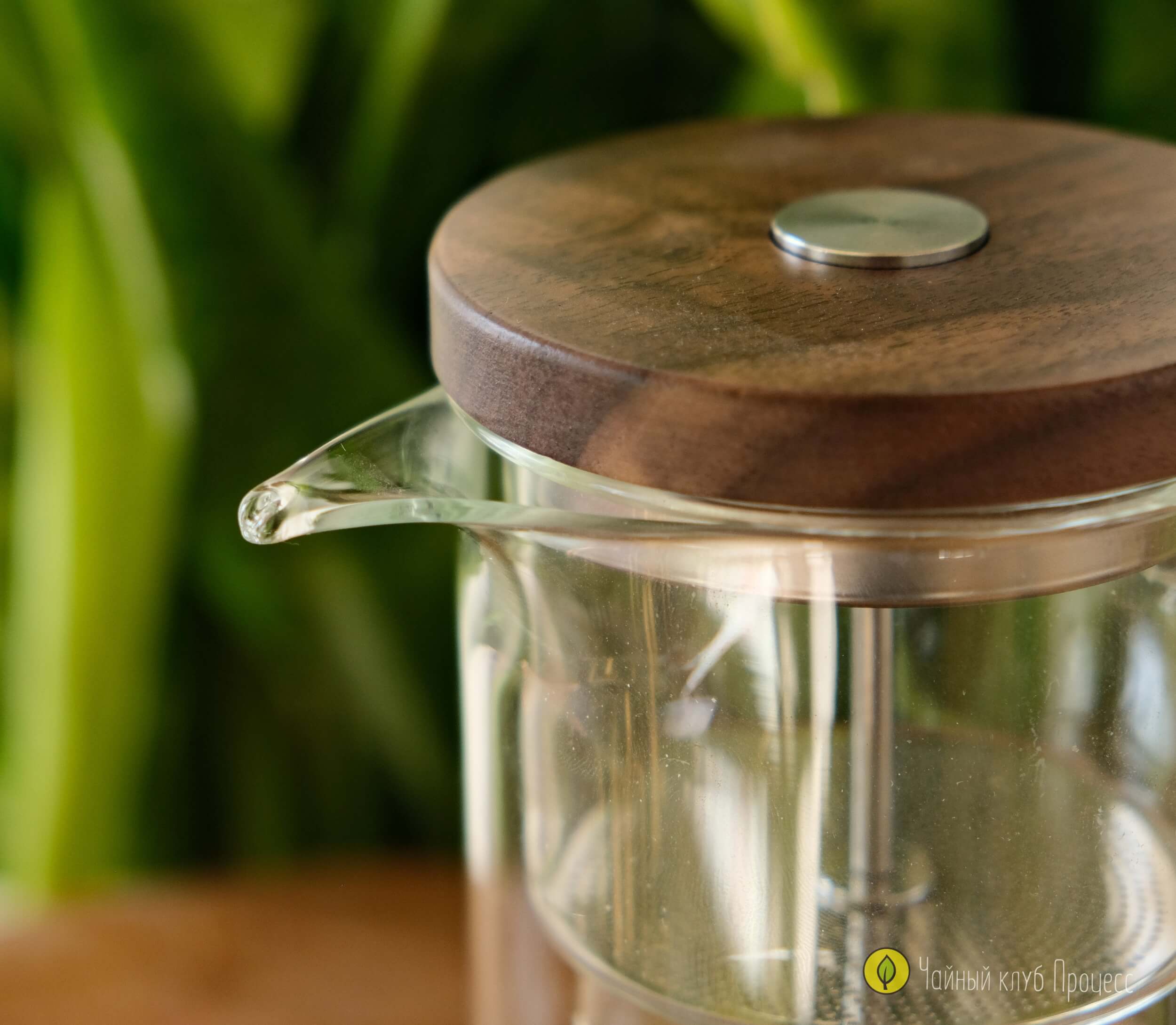Крышка выполнена из дерева и стали — тёплое и холодное в одном предмете. Чёрная стеклянная ручка удобна и не нагревается, носик выточен аккуратно, чтобы чай лился чистой, ровной струёй.