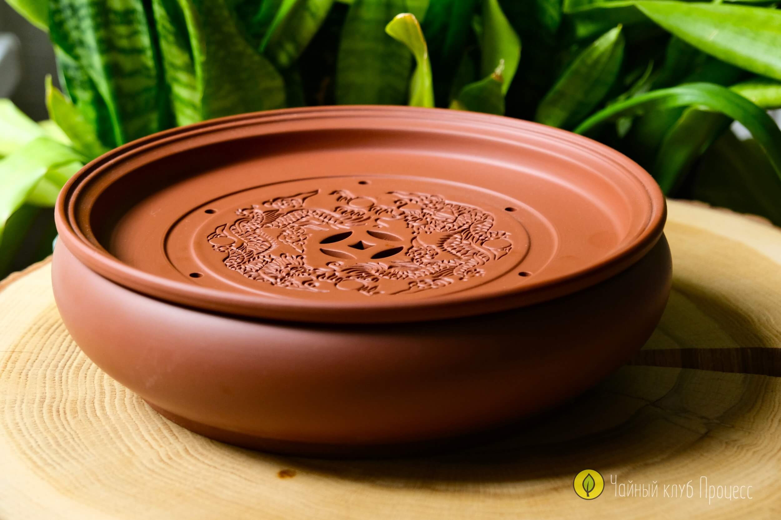 Этот круглый чайный пруд — впечатляющий и мощный предмет чайной сцены. Верхняя часть выполнена из исинской глины с резным изображением двух драконов, преследующих жемчужину — классический китайский символ, олицетворяющий силу, мудрость и бесконечность.
