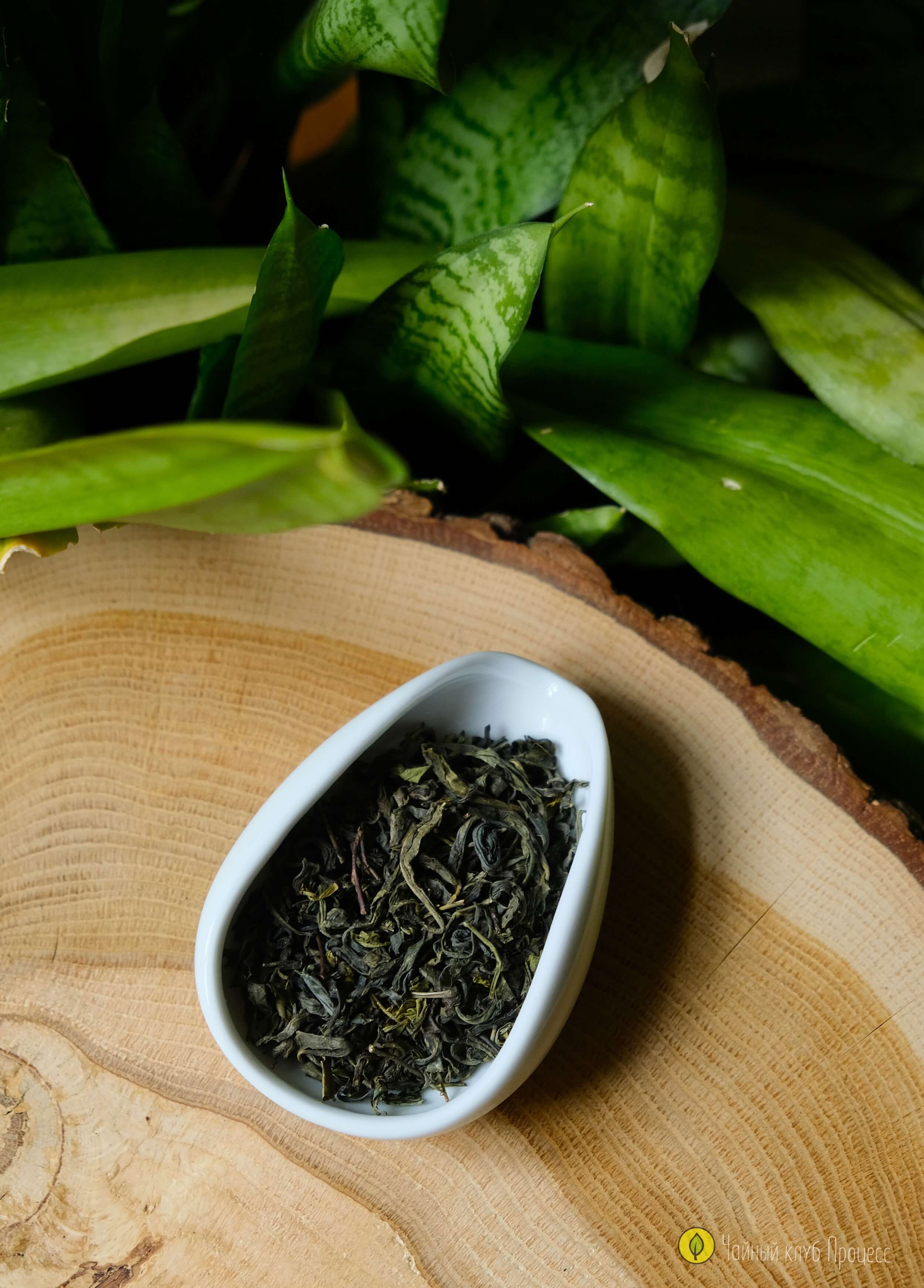Редкий зелёный чай, собранный с дикорастущих кустов в Чжэцзяне. Лист тёмный, скрученный, с характерной разнотравной структурой — видно, что сырьё не из культивированных посадок, а из живой, естественной среды.