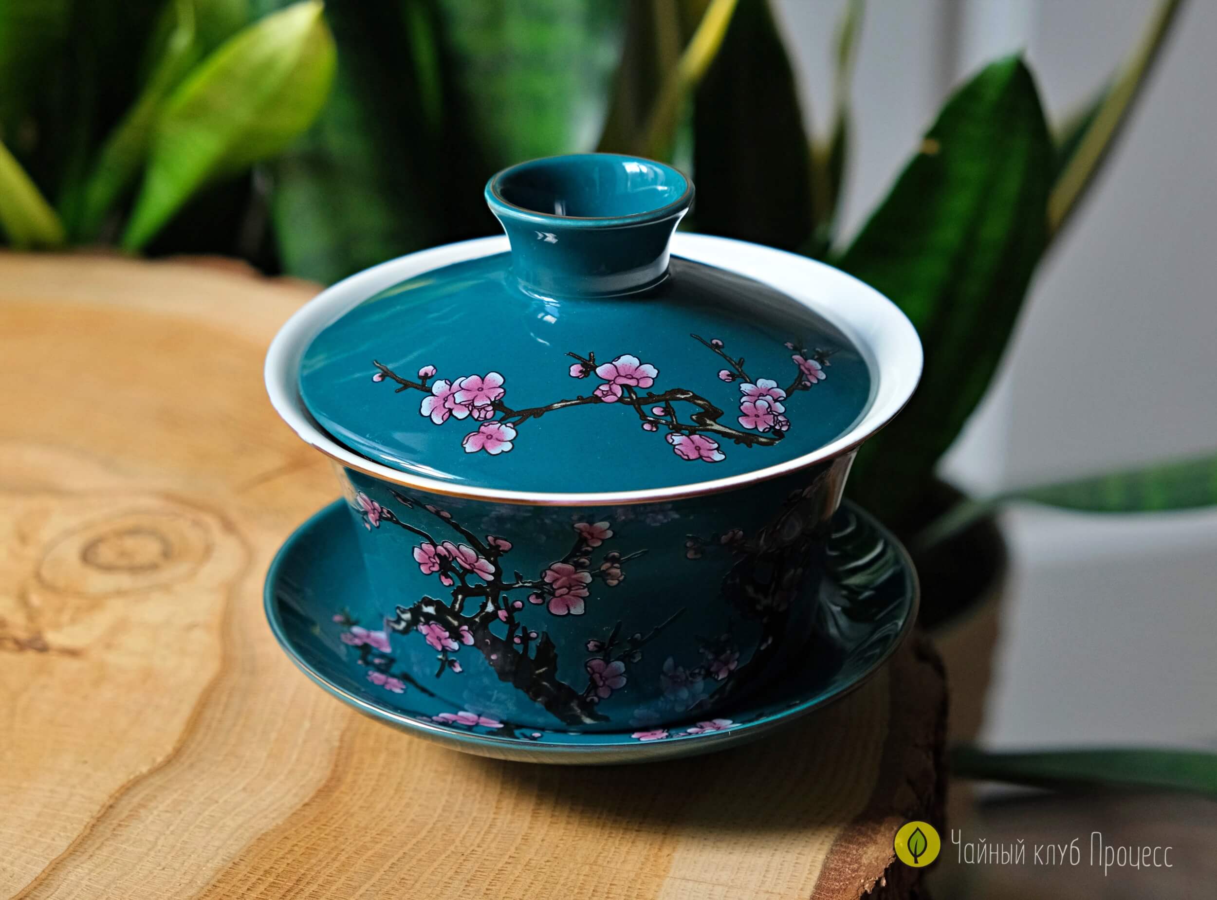 Гайвань «Цветение сливы» — крупная фарфоровая гайвань объёмом 300 мл с изысканным рисунком цветущих сливовых ветвей. Тёмно-бирюзовый фон подчёркивает нежные розовые цветы, создавая атмосферу спокойствия и глубины.