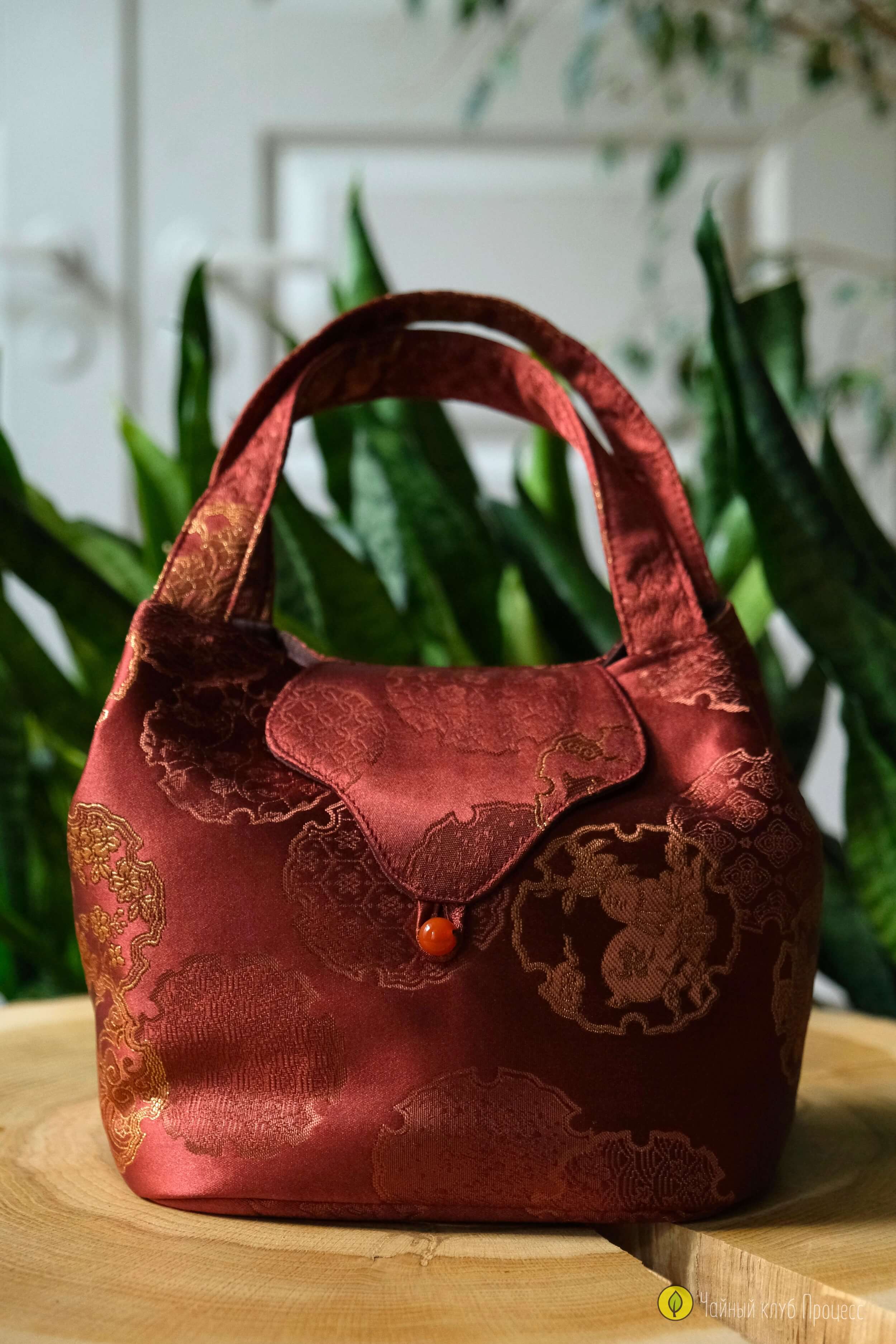 Сумка для хранения и переноски чайной посуды. Вмещает гайвань, чайник, пиалы и аксессуары. Внутри — съёмный мягкий вкладыш с тремя отделениями для надёжной фиксации. Снаружи — плотная ткань винно-красного цвета с золотым узором, внутри — хлопковая подкладка. Компактная, устойчивая и удобная в использовании.